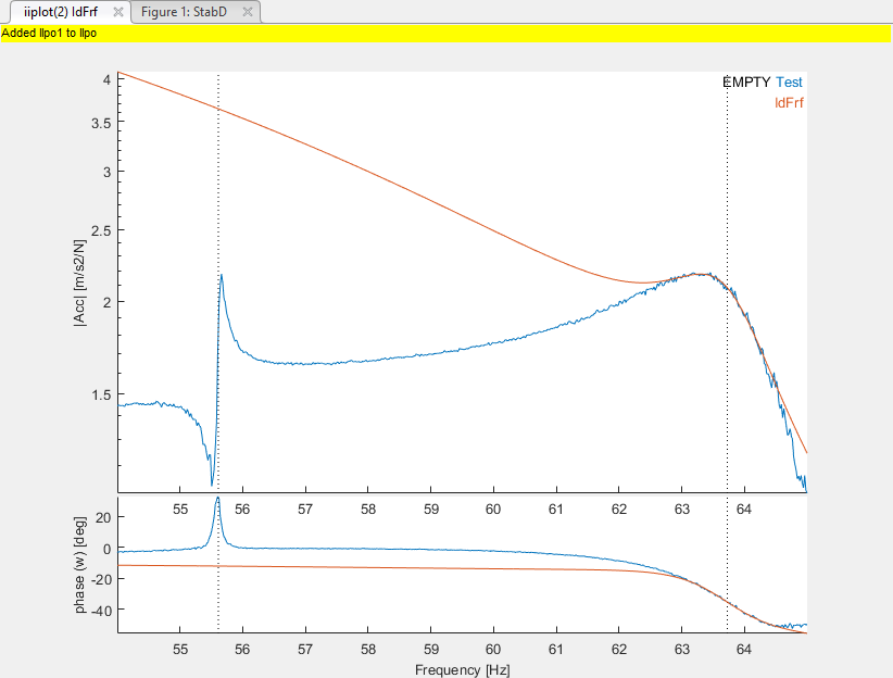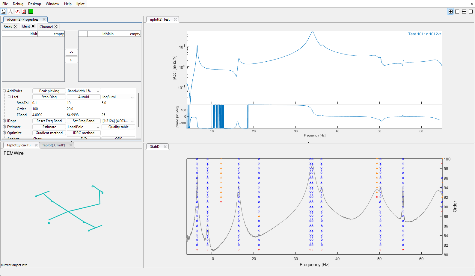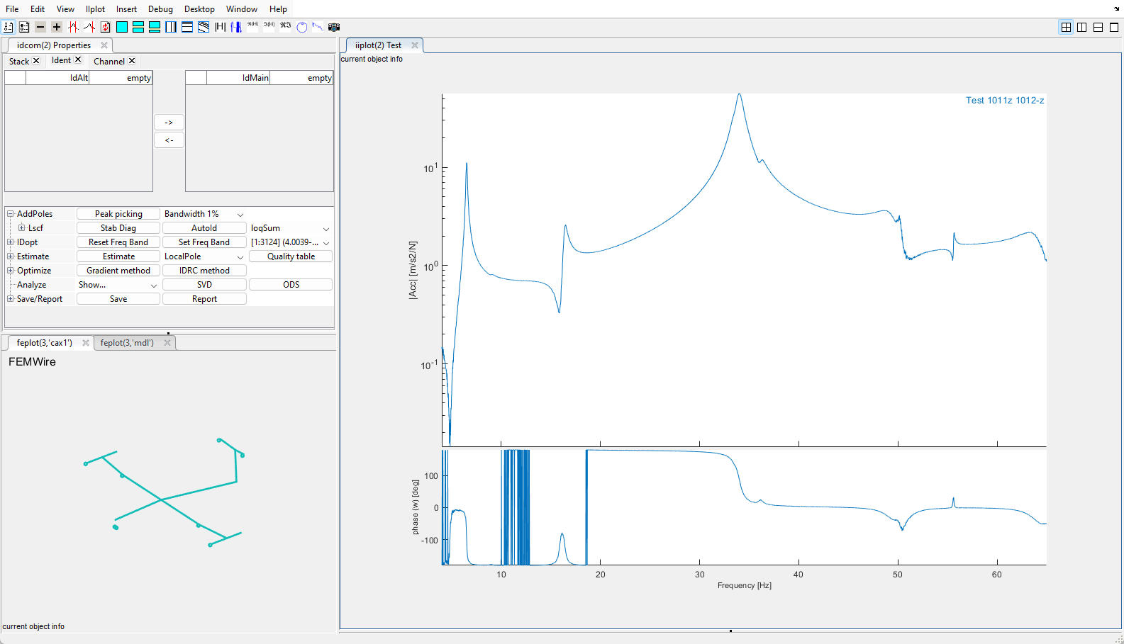 This phase of the identification relies heavily on user involvement. You are expected to visualize the different FRFs (use the +/- buttons/keys), check different frequency bands (zoom with the mouse and use iicom w commands), use Bode, Nyquist, MMIF, etc. (see iicom Show commands). The iiplot graphical user interface was designed to help you in this process and you should learn how to use it (you can get started in section 2.1).