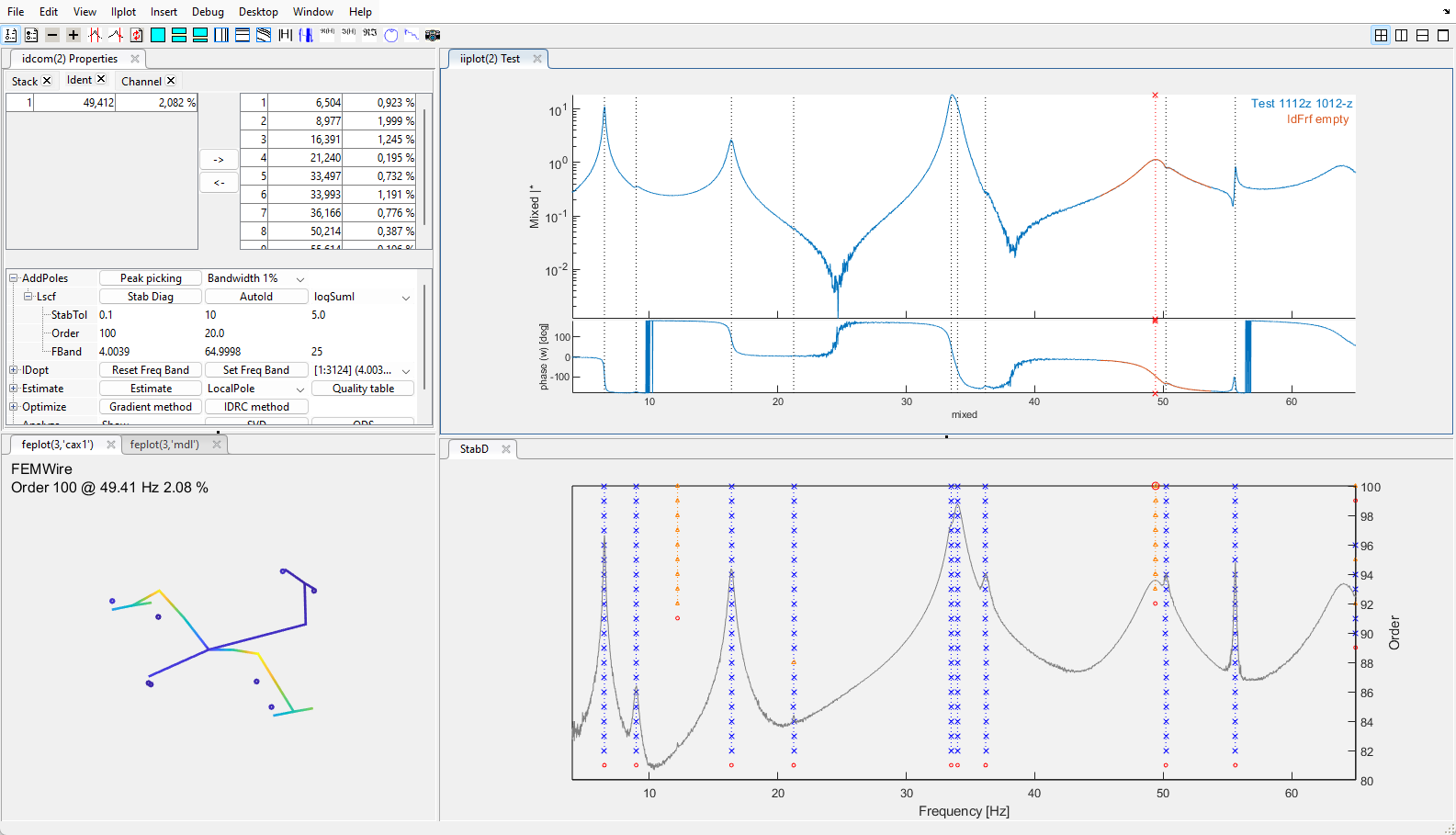 Because getting an initial estimate of the poles of the model is the often tedious, algorithms like LSCF or other broadband algorithms are very helpful to quickly extract most of the poles: dynamic responses of structures typically show lightly damped resonances which are most of the time well detected. Nevertheless, using such algorithm often leads to two issues that need to be handled: