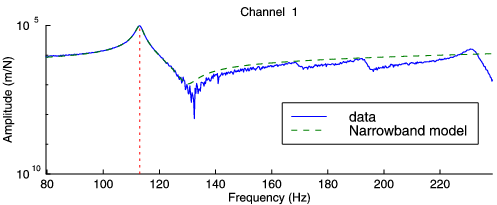 The idcom e command (based on a call to the ii_poest function) lets you to indicate a frequency (with the mouse or by giving a frequency value) and seeks a single pole narrow band model near this frequency (the pole is stored in ci.Stack{'IdAlt'}. Once the estimate found, the iiplot drawing axes are updated to overlay ci.Stack{'Test'} (the measured transfers) and ci.Stack{'IdFrf'} (the narrow band transfer synthesis).