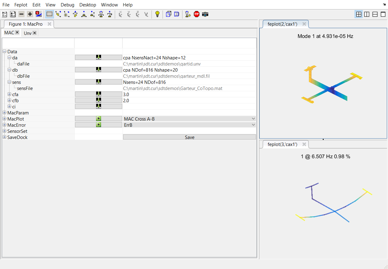 associated to the line da to load the identified modes. In the opening window, select the file SDTPath/sdtdemos/gartid.unv. This will open the Unv tab in which you need to select the line containing the shape data and click on import.Do the same with the line db to load numerical modes. Select the file SDTPath/sdtdemos/gart_mdl.fil (mode computation result from abaqus).