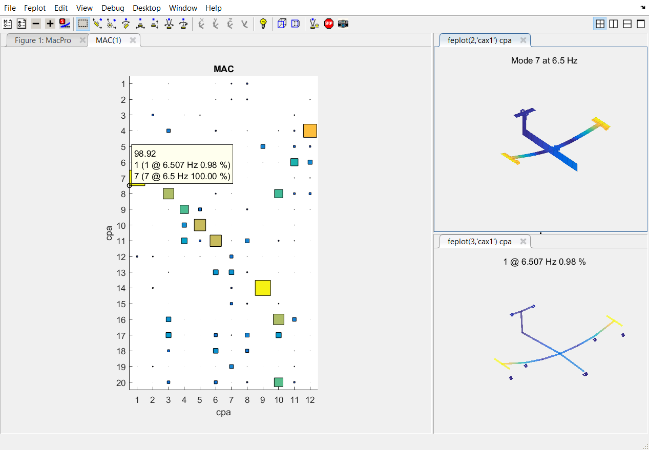 You can click on the square in the MAC matrix to interactively select the corresponding mode shapes in the feplot figure.