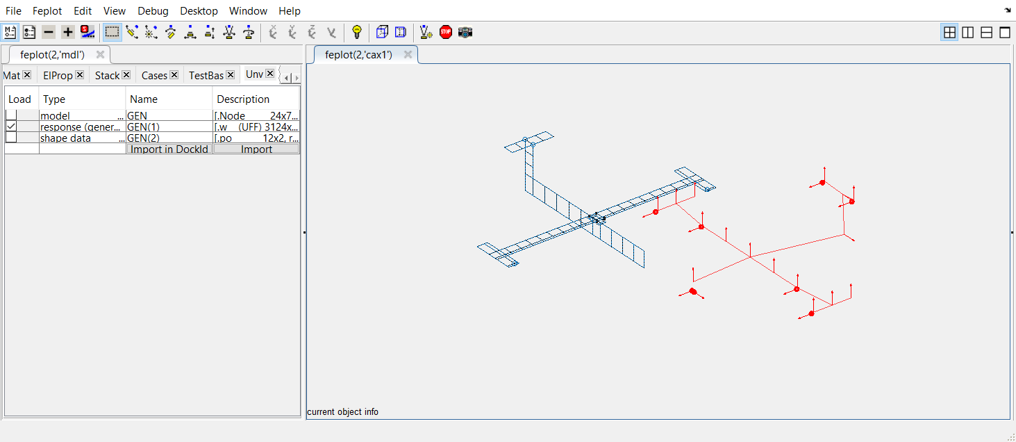 The test wireframe is loaded and displayed in the feplot figure in red.