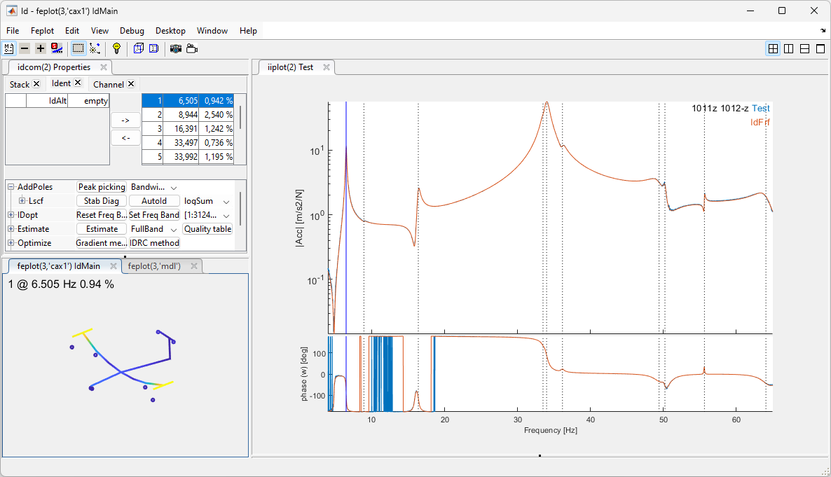 Identification is the process of estimating a parametric model (poles and modeshapes) that accurately represents measured data. The identification process is typically performed using the dock shown below opened with iicom('dockId').