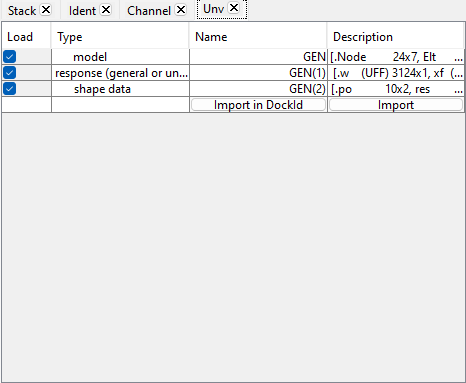 Once selected, the Unv tab is displayed in the idcom or the feplot('mdl') figure (depending the menu used to ImportData).