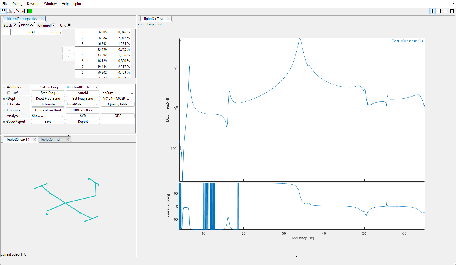 The data are loaded: transfers are shown in the iiplot figure, the wireframe in the feplot figure and the list of poles in the tab Ident of the idcom figure.