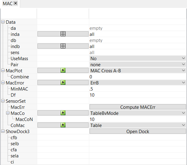 The MAC tab allows handling display of variants of Modal Assurance Criterion.