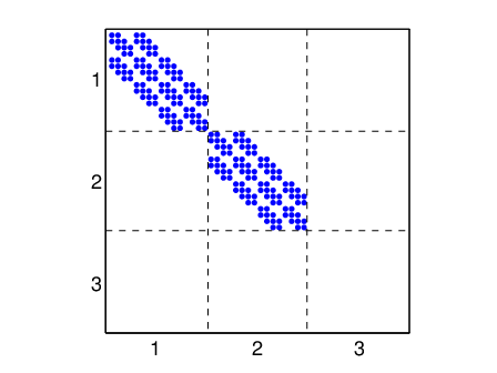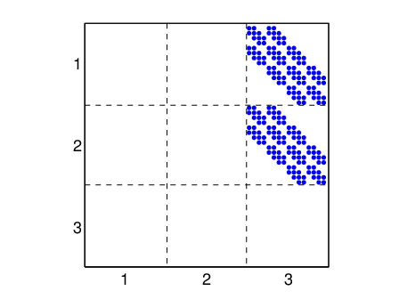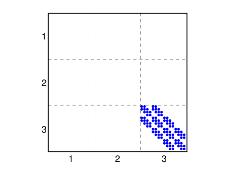 Figure 3.9 presents the topologies of the tangent contact-friction matrices expressed on the master surface DOF. The tangent contact matrix (3.30) couples the normal directions, here the third one, as shown in figure 3.9. The matrix is symmetric positive definite and used for real or complex mode computation.