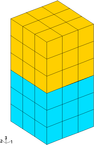 To illustrate the effect of the different tangent contact-friction matrices presented here, an example based on a very simple problem is presented. The basic model given in figure 3.9 features two cubes in vertical contact. For illustration purposes, the degrees of freedom are segregated by their direction, 1 and 2 define the horizontal directions while 3 is the vertical normal direction, in which contact is defined.