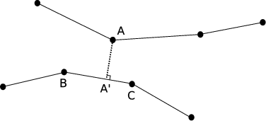 For a 2D application, as illustrated in figure 3.2.1, contact point A is projected as A' on the slave surface, defining the gap as distance AA'. For a displacement u, the displacement of A' is expressed as a combination of the displacements of B and C, which are nodes of the slave surface model.