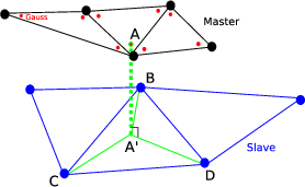 Once master and slave surfaces are identified, the so called contact points must be chosen. They will be the points where contact-friction forces will be actually computed for the mechanical equilibrium. In practice, they are points of the master surface, typically, the surface nodes are chosen, or in our case, the Gauss integration points of the underlying elements (red dots in figure 3.2.1). The interest in choosing Gauss points for contact resides in the fact that an element-wise handling is permitted which allows usual integration rules to be employed and simplifies handling of surfaces for the definition of contact pressures.