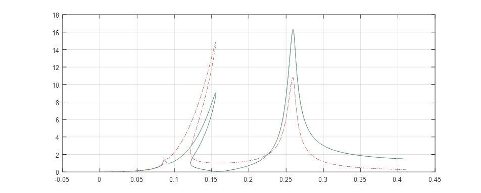 As a second example clima16('BeamNLARange'), one seeks to illustrate the amplitude dependence obtained for a stiffening spring.