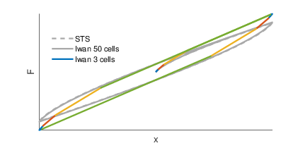 where hyperelasticity is represented using a tabular form with either linear of piecewise cubic interpolation with no internal states Fg0(ug) (stored as NLdata.Fu{k})and other behavior is represented using a series of cells (also called branches in reference to the classical rheologic representation of figure 1.3), specified using a field .cell where each row describes a branch indexed by i with [ty gi fi xfi ai] type, load fraction, and if used frequency in Hz , sliding distance, non-linearity coefficient. xxx Note that the convention is to declare constants using a fraction of the high frequency modulus