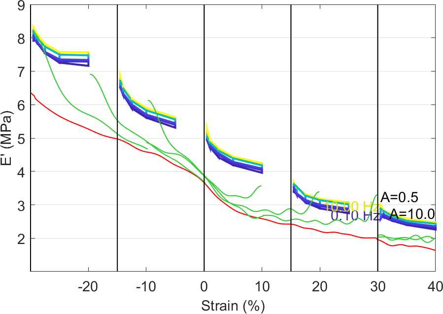 For the representation of bushings, each Gauss point is a scalar (0D) constitutive law that considers a combination of hyperelastic (red curve in figure 1.2), rate independent hysteresis (green curves from low speed triangular testing), and viscoelastic behavior (blue to yellow maps denoting frequency and amplitude dependence from sine testing).
