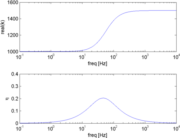 Following example considers K0=1000N/m, K1=500N/m and C1=1.4Ns/m. These parameters lead to a maximum loss factor of 20.14% for a frequency of 46.41Hz. The module and the loss factor are represented in figure 4.6.