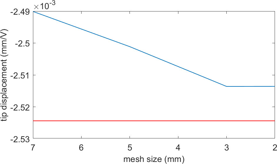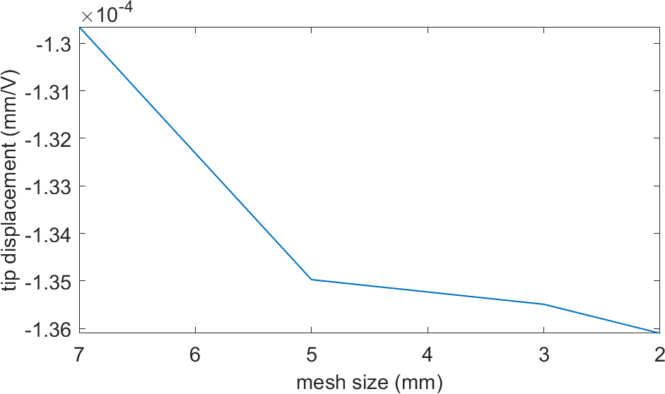 Figure 5.7: Convergence of the tip displacement when the size of the elements of the main plate is varied, for a circular piezoelectric patch