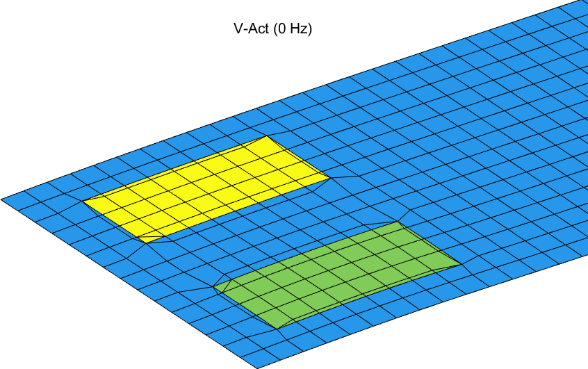 %% Step 2: Add patches RG.list={'Name','Lam','shape' 'Main_plate', model,'' % Base structure 'Act1', ... % name of patch 'BaseId1 -Rect.Sonox_P502_iso.5525TH0_25 +Rect.Sonox_P502_iso.5525TH0_25', ... struct('shape','LsRect', ... % Remeshing strategy (lsutil rect here) 'xc',15+55/2,'yc',12+25/2,'alpha',0,'tolE',.1) 'Act2', ... % name of patch 'BaseId1 -Rect.Sonox_P502_iso.5525TH0_25 +Rect.Sonox_P502_iso.5525TH0_25', ... struct('shape','LsRect', ... % Remeshing strategy (lsutil rect here) 'xc',15+55/2,'yc',63+25/2,'alpha',0,'tolE',.1) }; mo1=d_piezo('MeshPlate',RG); mo1=stack_rm(mo1,'info','Electrodes'); % Obsolete stack field to be removed % To avoid warning due to the use of simplified piezo properties. mo1=p_piezo('DToSimple',mo1);