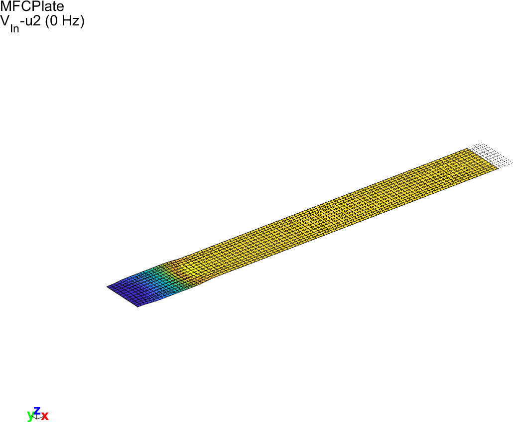 , we build the mesh, define the sensors and actuators, and compute the static response. Using the two MFCs as actuators, we define two combinations in order to induce bending or traction and compute and represent the static response in (Figure 7.26).