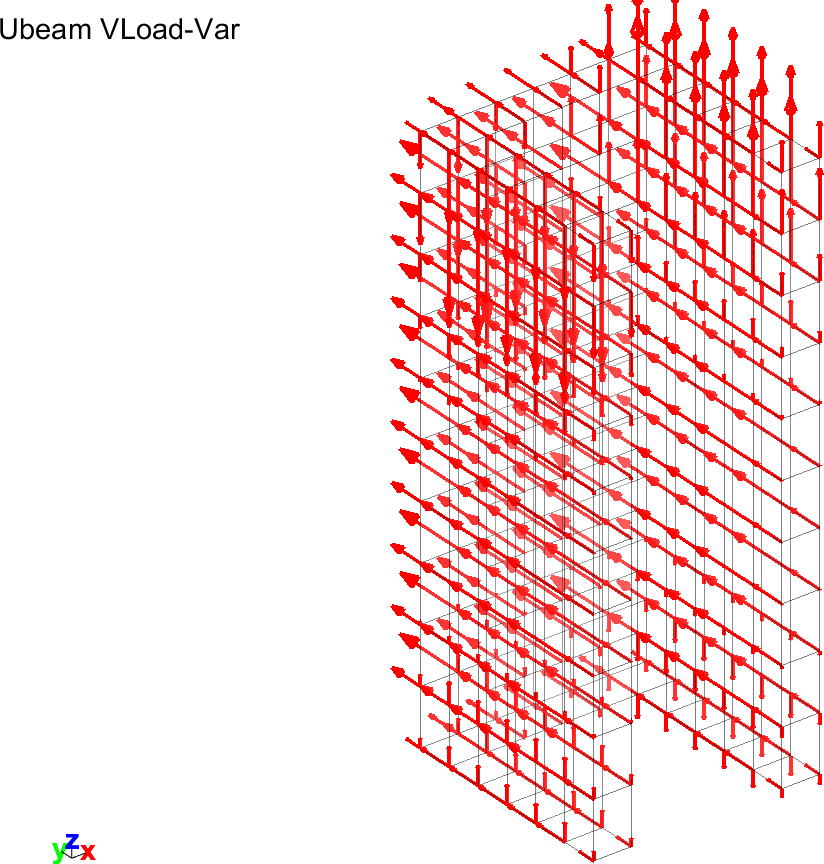 %% Step 1 Apply a volumic load and represent model = femesh('testubeam'); data=struct('sel','groupall','dir',[0 32 0]); data2=struct('sel','groupall','dir',{{0,0,'(z-1).^3.*x'}}); model=fe_case(model,'FVol','Constant',data, ... 'FVol','Variable',data2); % Visualize loads cf=feplot(model); iimouse('resetview'); % Make mesh transparent : fecom('showfialpha') % % Visualize Load fecom proviewon % Improve figure sdth.urn('Tab(Cases,Constant){deflen,.5,arProp,"linewidth,2"}',cf) fecom curtabcases 'Constant' % Shows the case 'Constant'