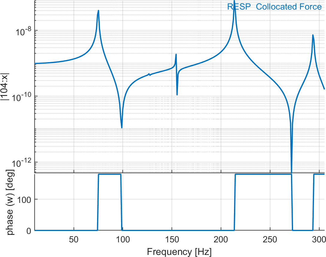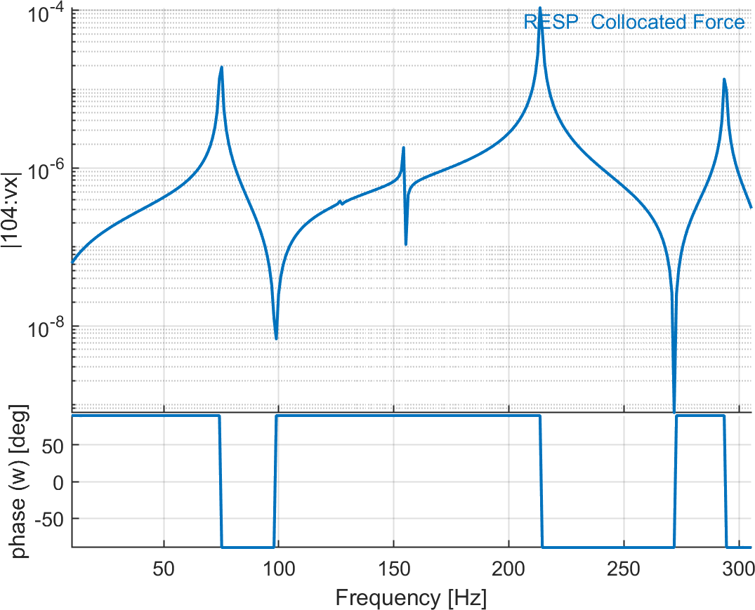 %% Step 2 : Introduce a point displ/vel/acc sensor and collocated force model = fe_case(model,'SensDOF','Sensors',{'104:x';'104:vx';'104:ax'}); model=fe_case(model,'DofLoad SensDof','Collocated Force','Sensors:1'); % 1 for first sensor if there are multiple
