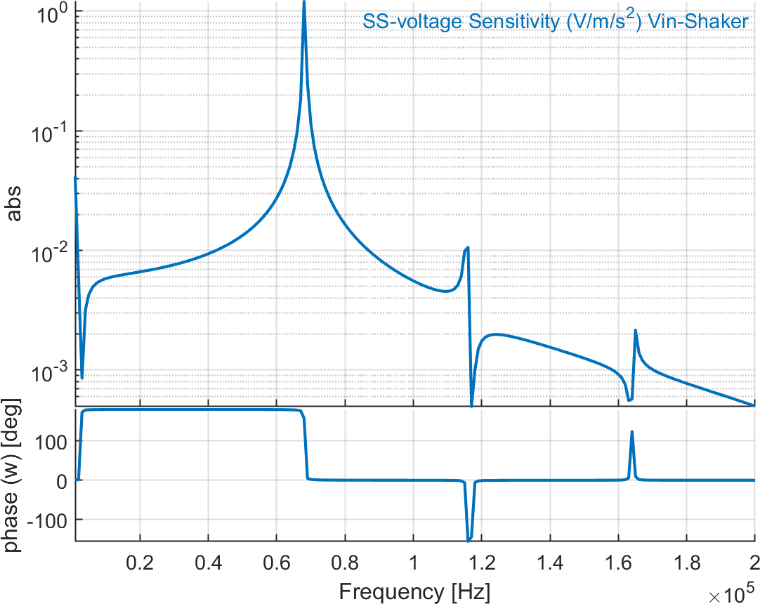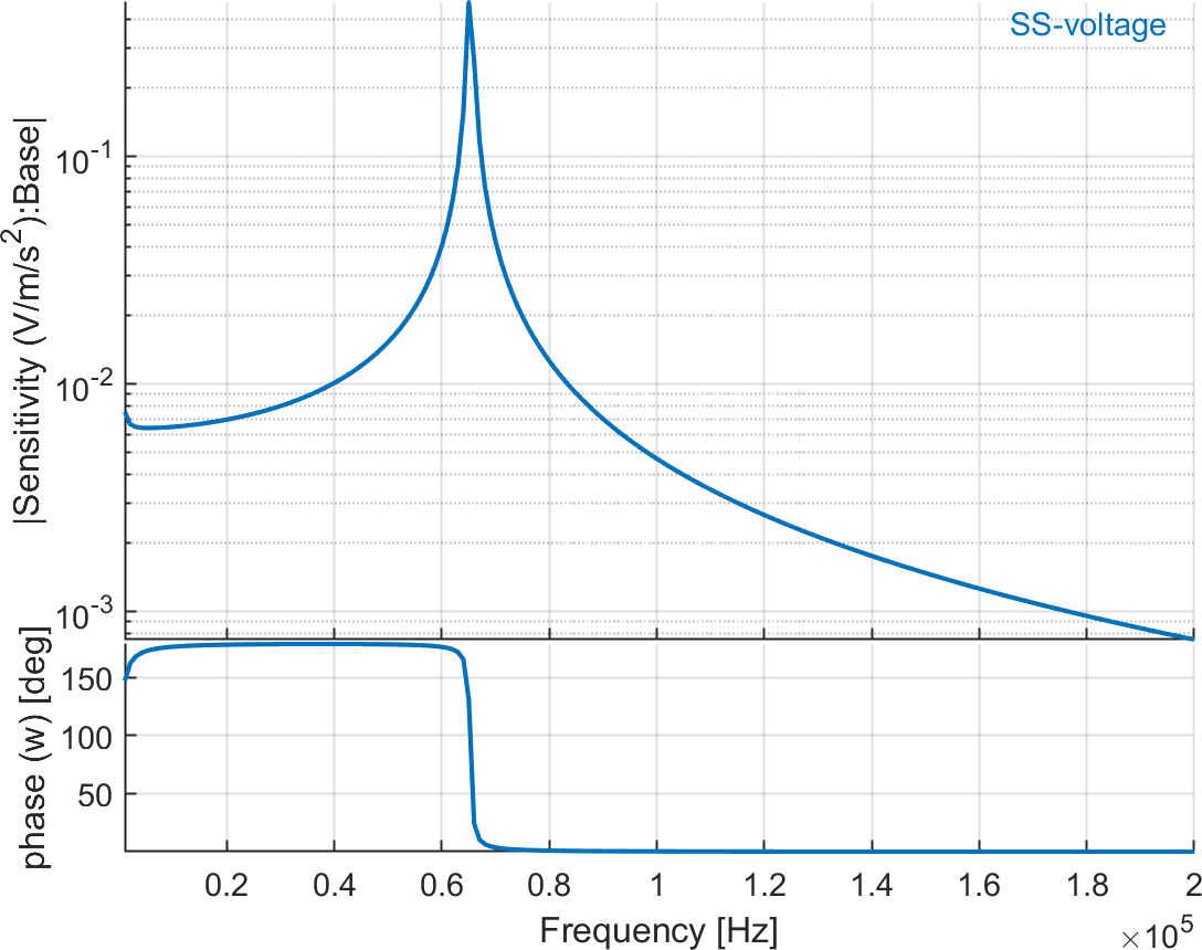 The sensitivity curve of the accelerometer, expressed in V/m/s2 is used to assess the response of the sensor to a base acceleration in the sensing direction (here vertical). In order to compute this sensitivity curve, one needs therefore to apply a uniform vertical base acceleration to the sensor and to compute the response of the sensing element as a function of the frequency.