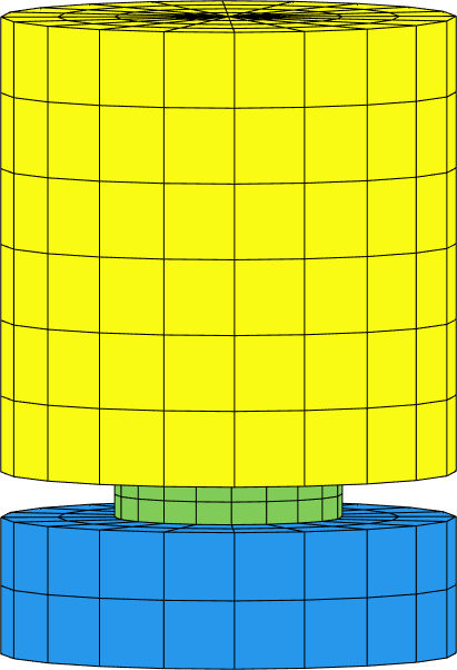 A basic design of a piezoelectric accelerometer working in the longitudinal mode is shown in Figure 8.3. In this example, the casing of the accelerometer is not taken into account, so that the device consists in a 3mm thick rigid wear plate (10mm diameter), a 1mm thick piezoelectric element (5mm diameter), and a 10mm thick (10mm diameter) steel proof mass. The mechanical properties of the three elements are given in Table 8.1. The piezoelectric properties of the sensing element are given in Table 8.2 and correspond to SONOX_P502_iso property in m_piezo Database. The sensing element is poled through the thickness and the two electrodes are on the top and bottom surfaces.