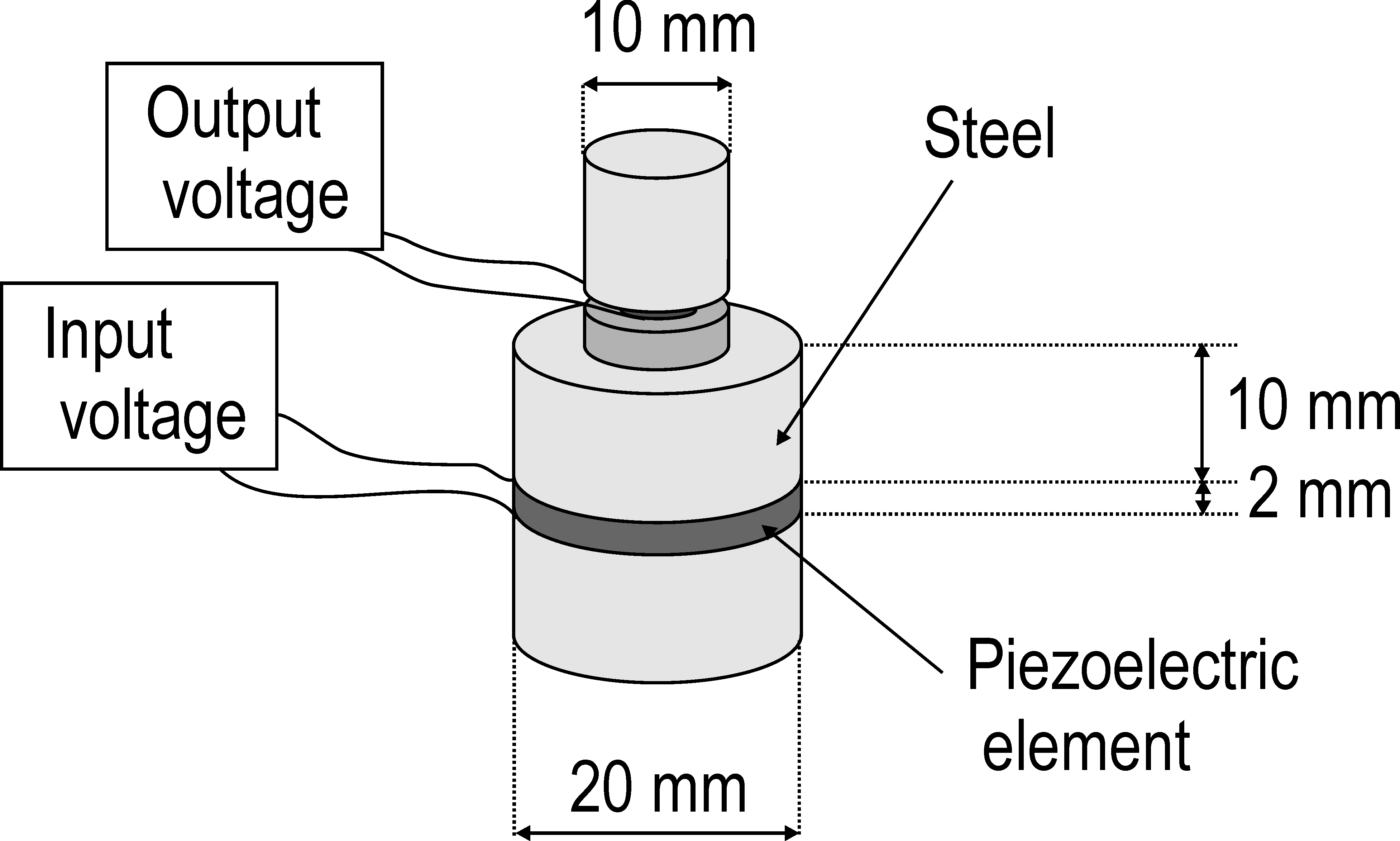 Experimentally, the sensitivity curve can be measured by attaching the accelerometer to a shaker in order to excite the base. Usually, this is done with an electromagnetic shaker, but we illustrate in the following example the use of a piezoelectric shaker for sensor calibration. The piezoelectric shaker consists of two steel cylindrical parts with a piezoelectric disc inserted in between. The base of the shaker is fixed and the piezoelectric element is used as an actuator: imposing a voltage difference between the electrodes results in the motion of the top surface of the shaker to which the accelerometer is attached (Figure 8.7).