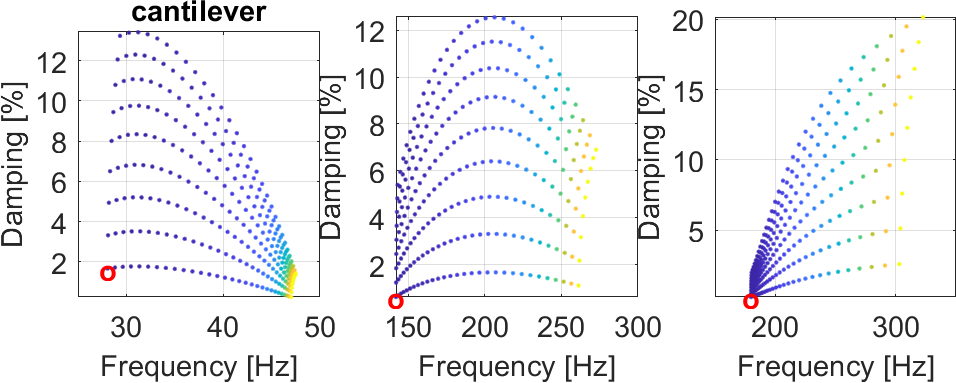 Up=d_visco('meshplate upreset'); %Up=fevisco('testplate up'); Up=stack_rm(Up,'mat'); Up = fevisco('addmat 101',Up,'Area1','ISD112 (1993)'); Up = fevisco('addmat 103',Up,'Area2','ISD112 (1993)'); MV=fevisco('makemodel matid 101 103',Up); cf=feplot(MV); cf.Stack{'info','Range'}=[10;30]; cf.Stack{'info','Freq'}=[30:.5:500]'; % Target frequencies Hz cf.Stack{'info','EigOpt'}=[6 40 -(2*pi*30)^2 11]; fe2xf('directfirst zCoef0',cf); ci=iiplot(cf.Stack{'curve','RESP'}); iicom('challDesign point') % This is a call to the new strategy for pole tracking as function of temp RO=struct('IndMode',7:20,'Temp',20:10:100,'Freq',logspace(1,4,20)'); Po=fevisco('poletemp',cf,{'Area1';'Area2'},RO); fe2xf('plotpolesearch',Po)